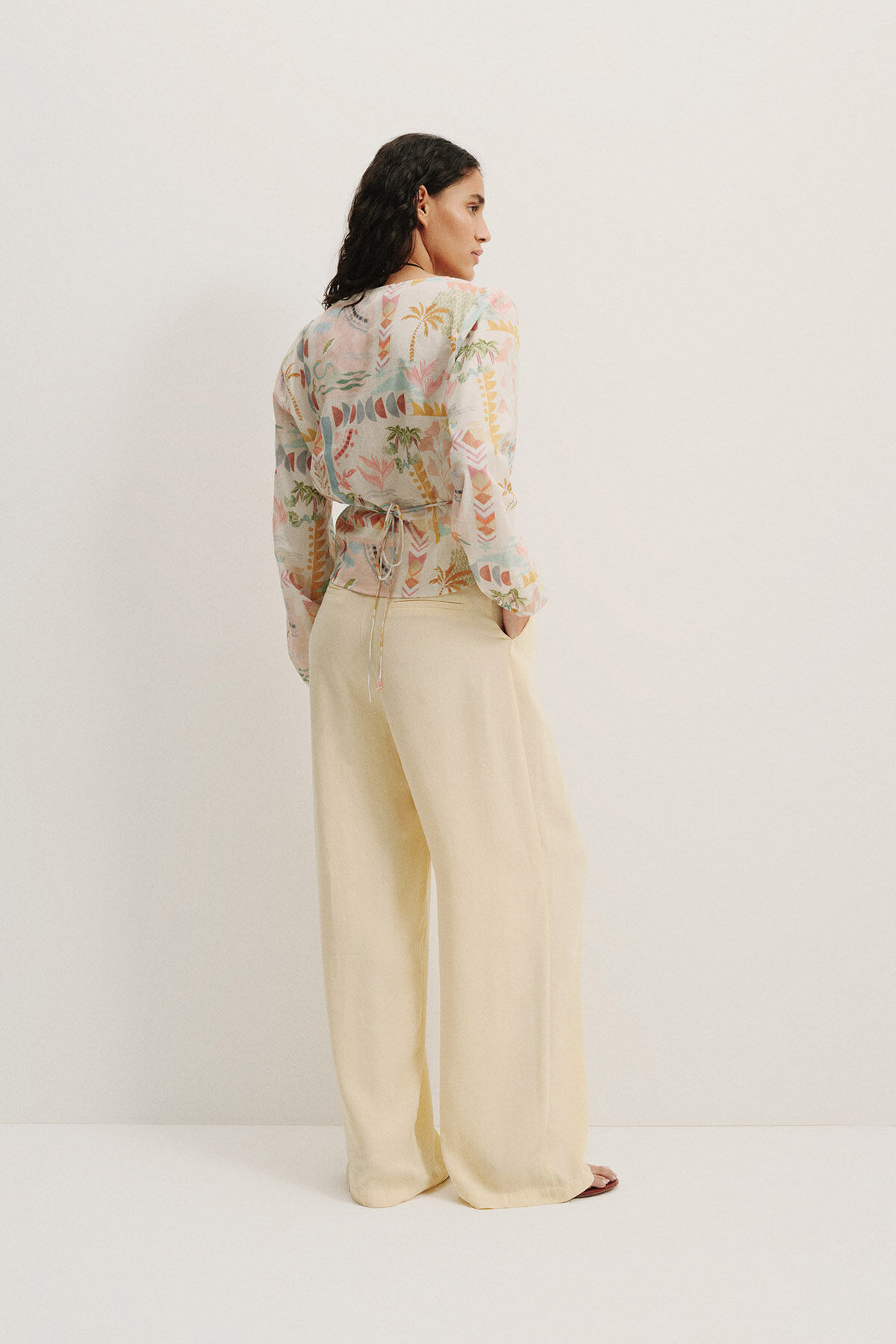 These light yellow palazzo trousers stand out with their soft texture and elegant silhouette, crafted from breathable 100% Tencel fabric for all-day comfort. The front pleat details add sophistication, while the belted waist ensures a flattering fit. Designed with a wide-leg cut and practical side pockets, this stylish piece combines fashion and functionality. Perfect for both casual wear and dressier occasions.
