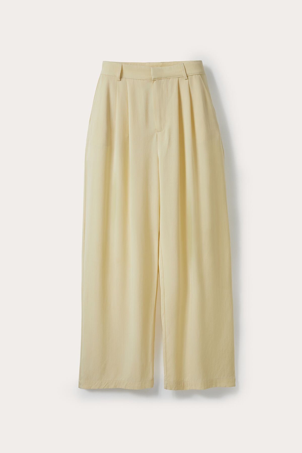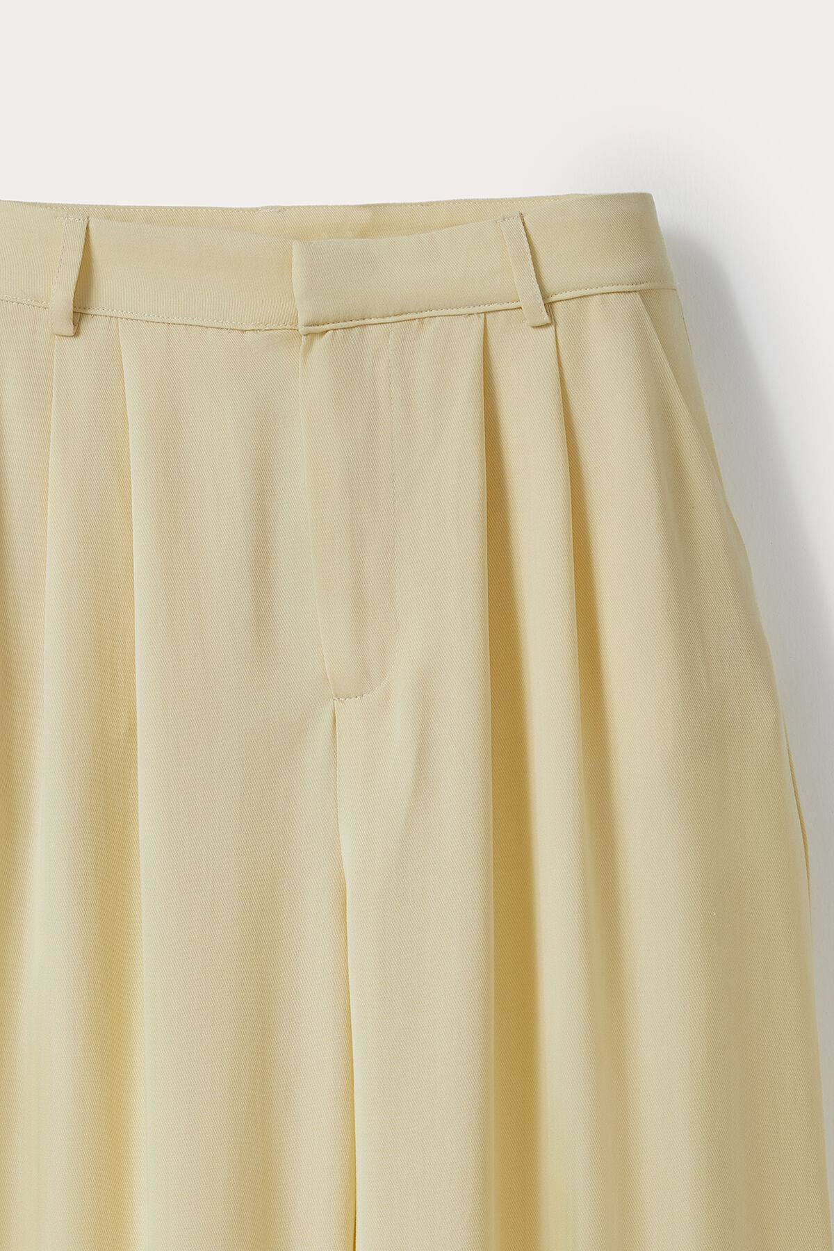 Notify me when its in stockLight Yellow Tencel Fabric Palazzo Trousers with Front Pleats, Belted Waist, Pockets, and Wide-Leg Fit