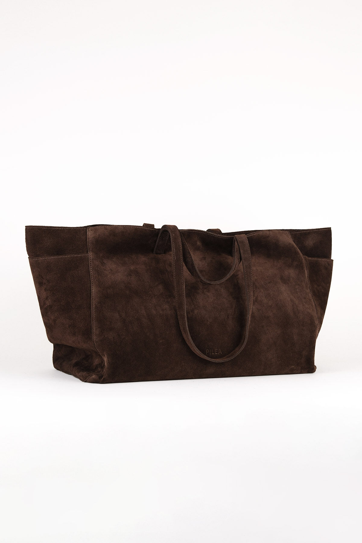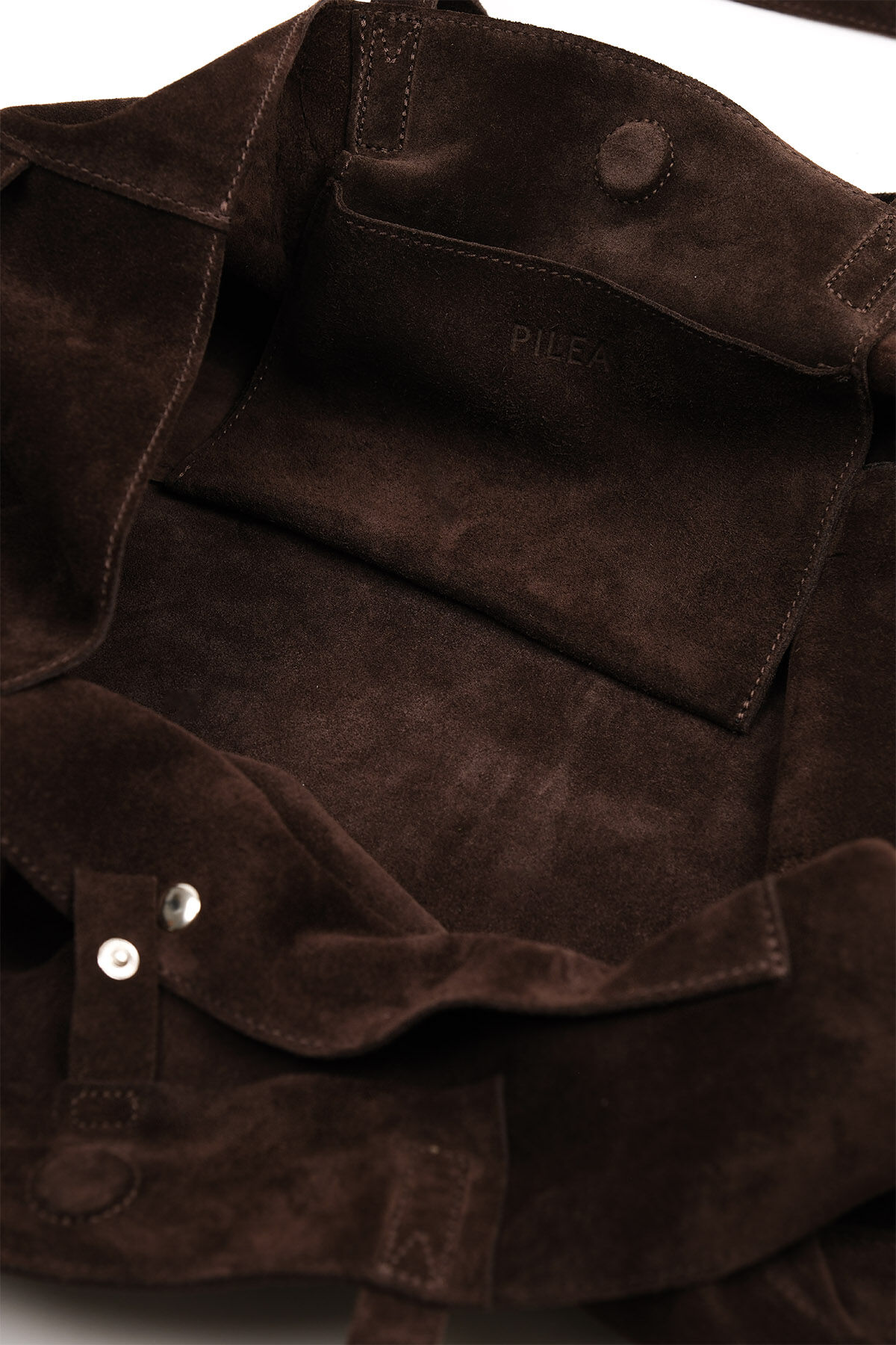 Notify me when its in stockBrown suede leather maxi shopper bag with side pocket details, dual handles, interior pockets, and magnetic button closure
