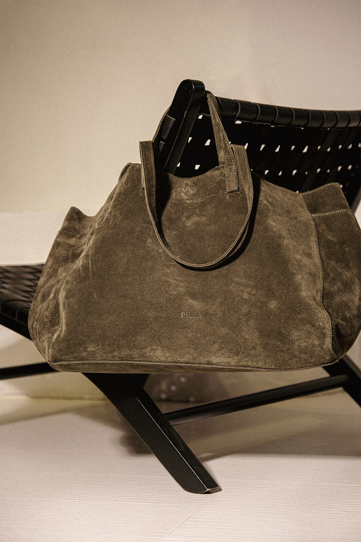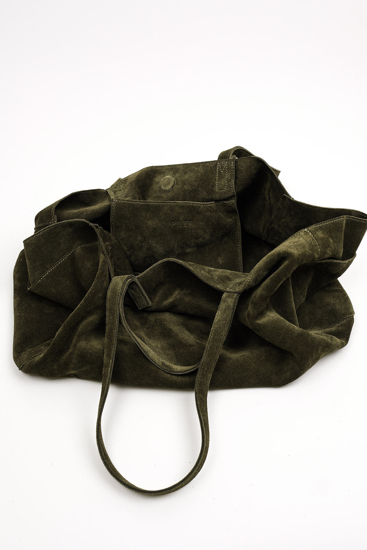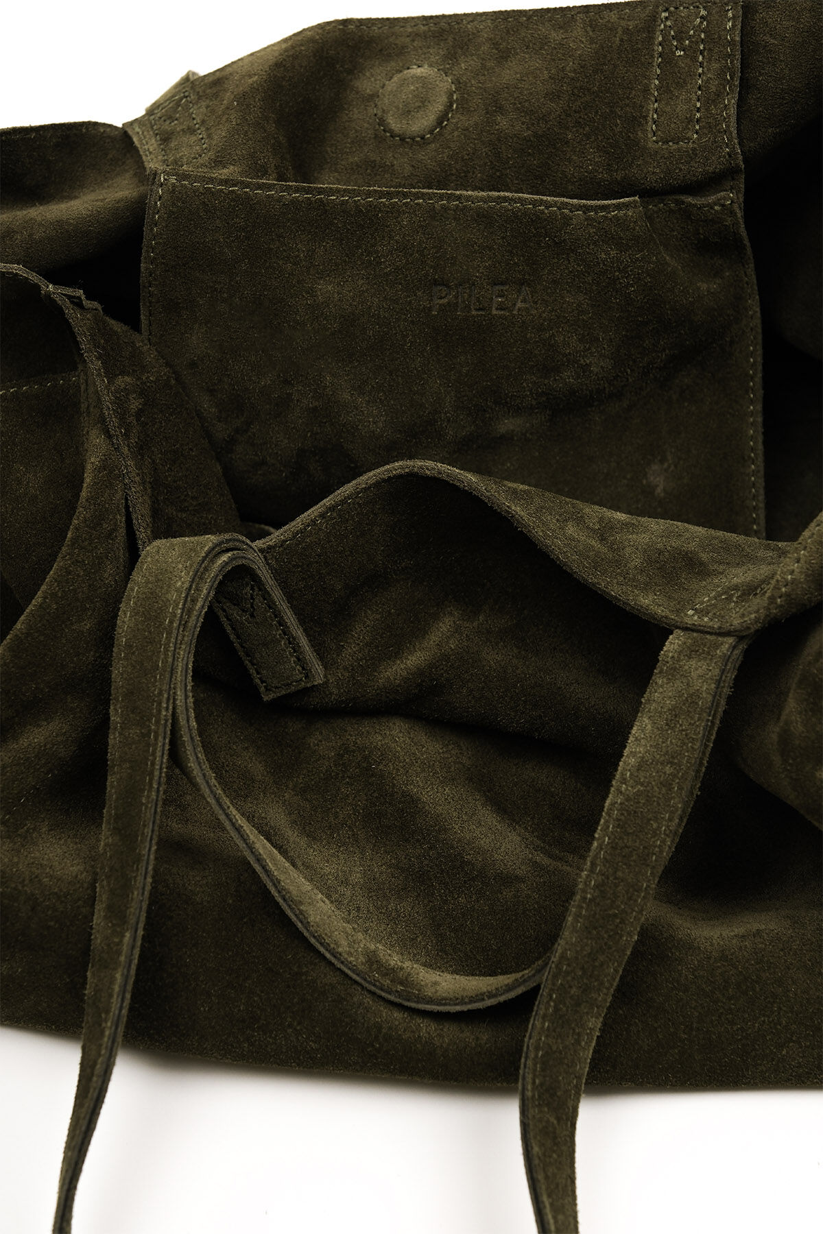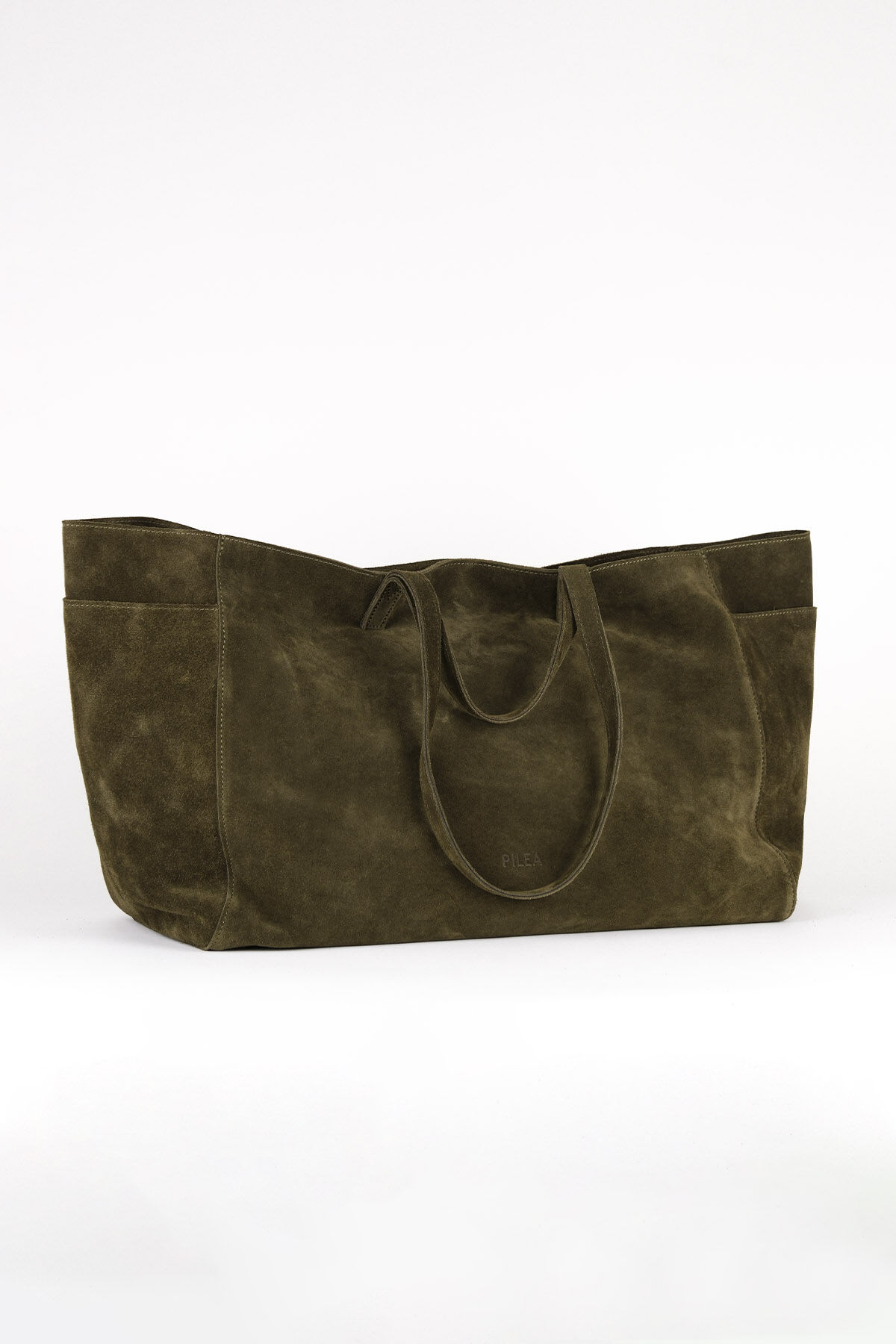 Notify me when its in stockKhaki suede leather maxi shopper bag with side pocket details, dual handles, interior pockets, and magnetic button closure