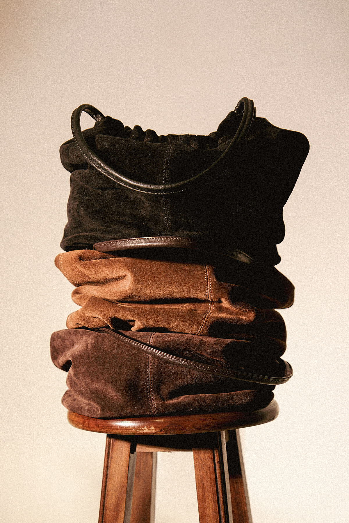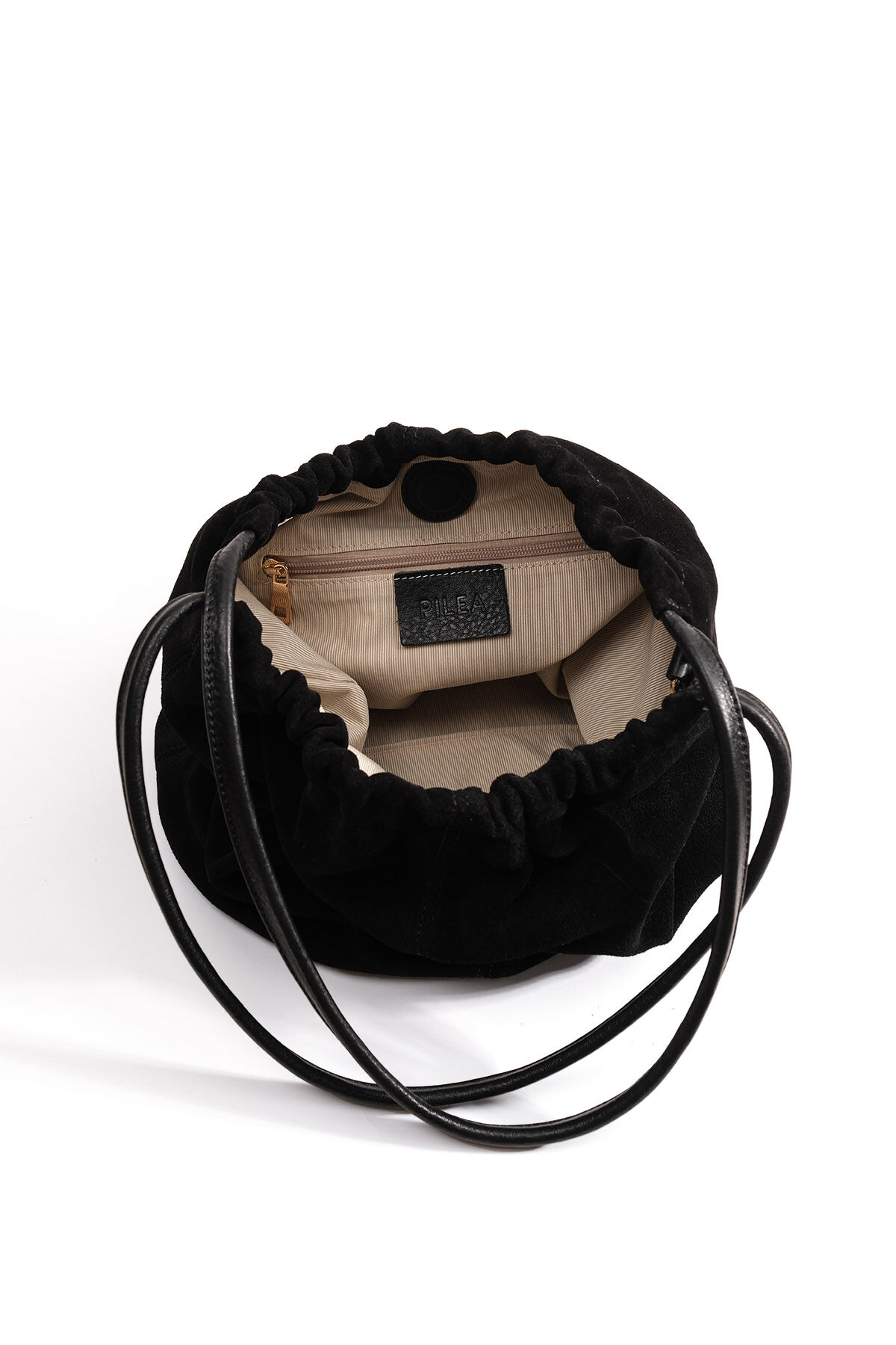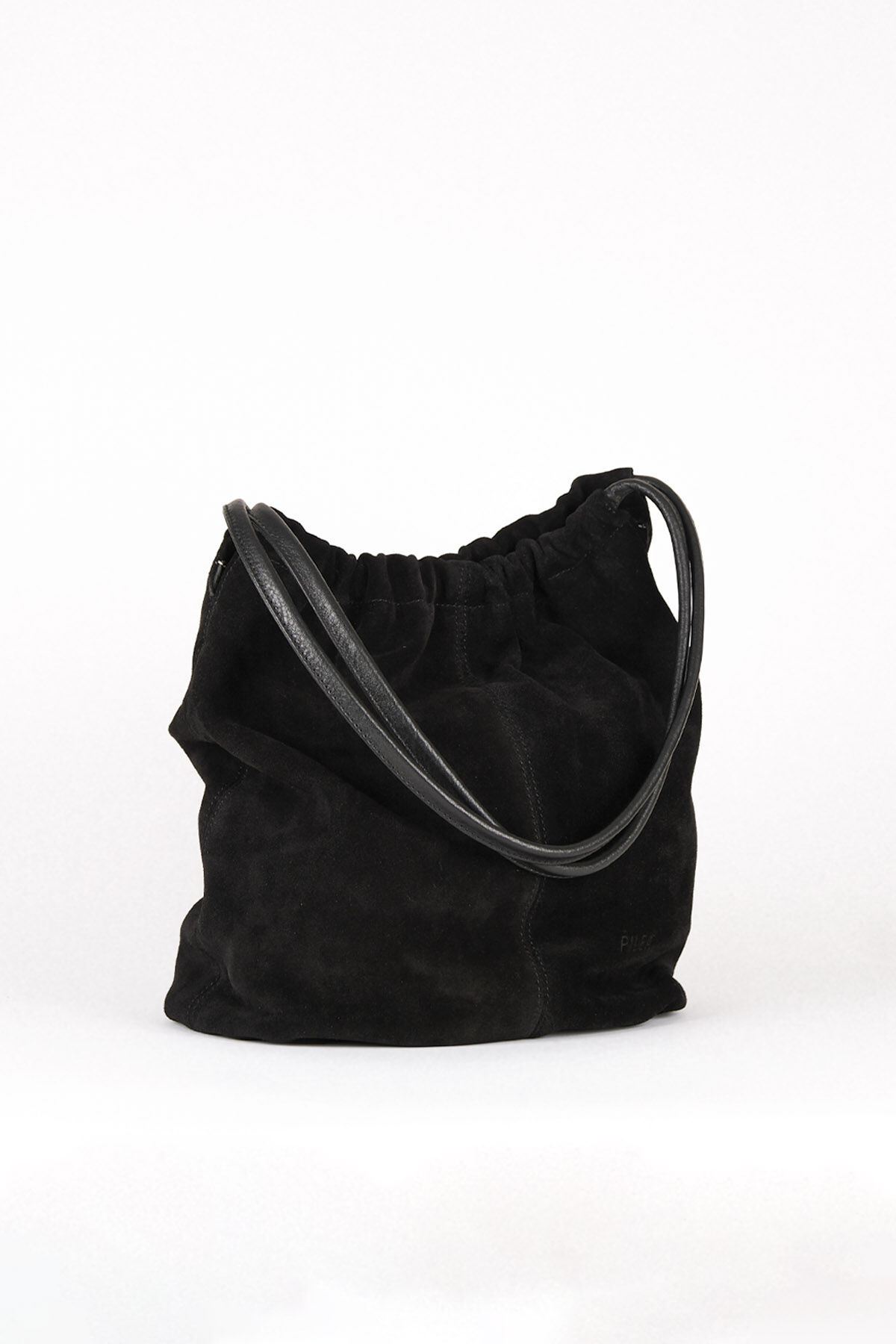 Notify me when its in stockBlack suede leather gathered bag with dual handles, removable shoulder strap, lined interior with double pockets, magnetic closure, and printed logo