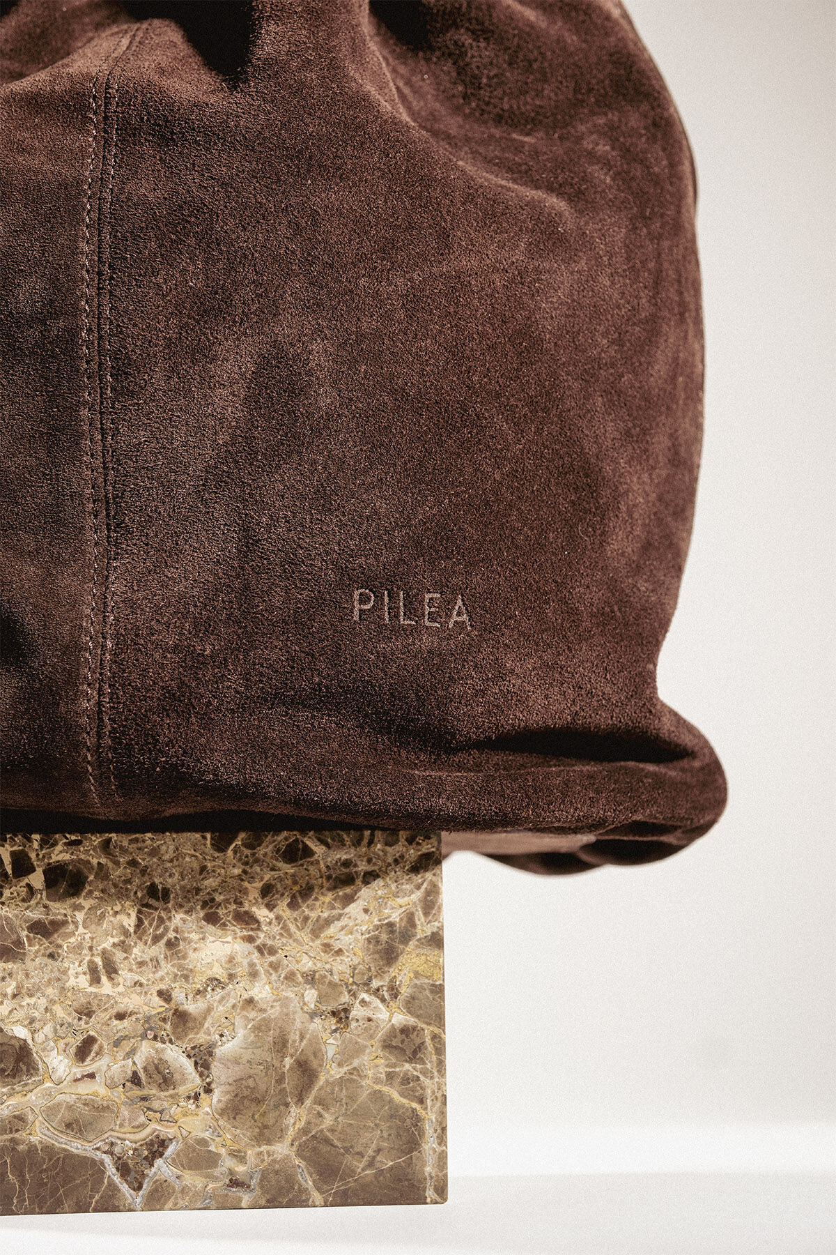 Notify me when its in stockMaroon suede leather gathered bag with dual handles, removable shoulder strap, lined interior with double pockets, magnetic closure, and printed logo