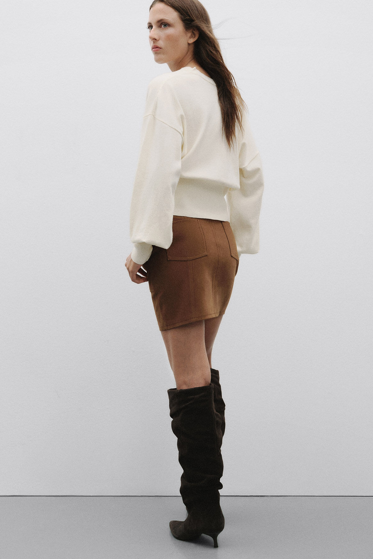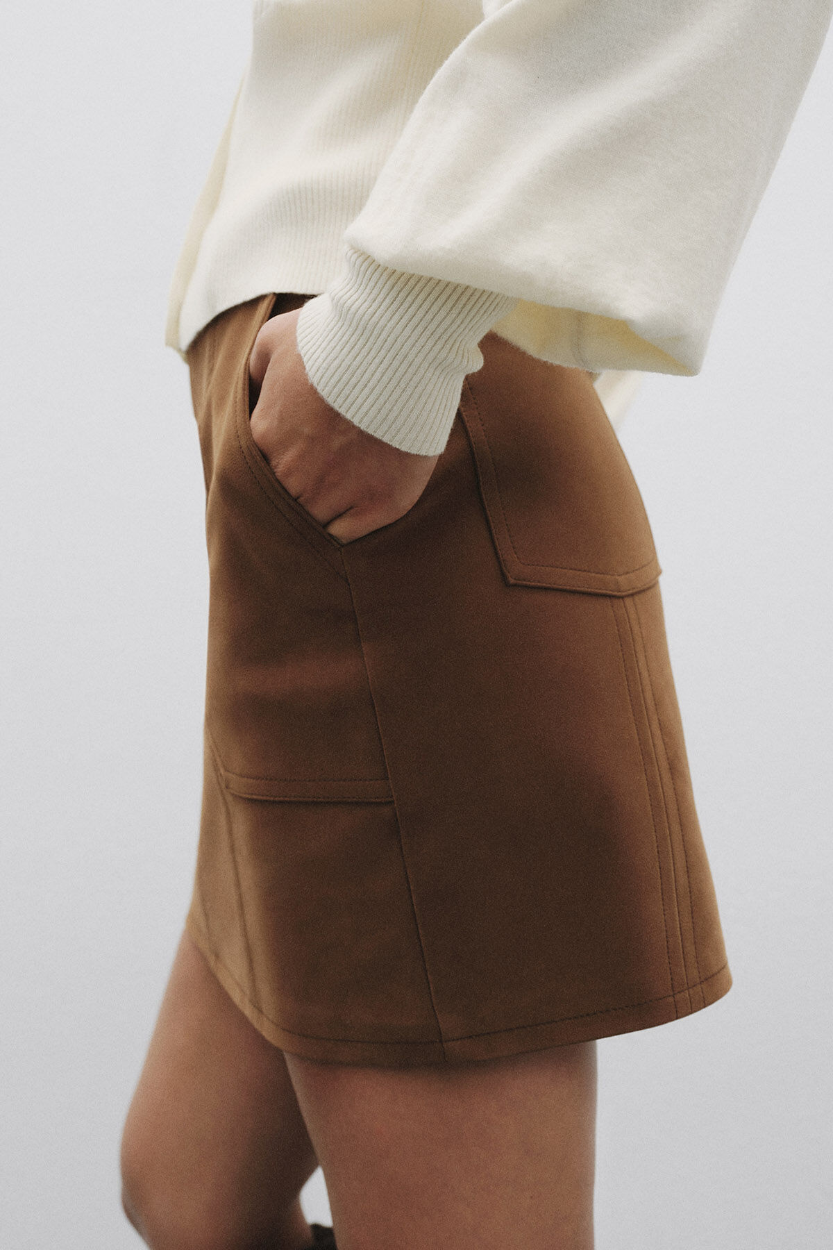 Gelince Haber VerTaba rengi süet görünümlü kumaştan cepli önden dikiş detaylı beli kemer köprülü mini dar kesim mini etek.