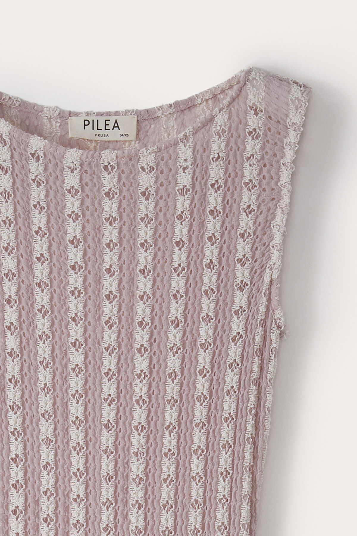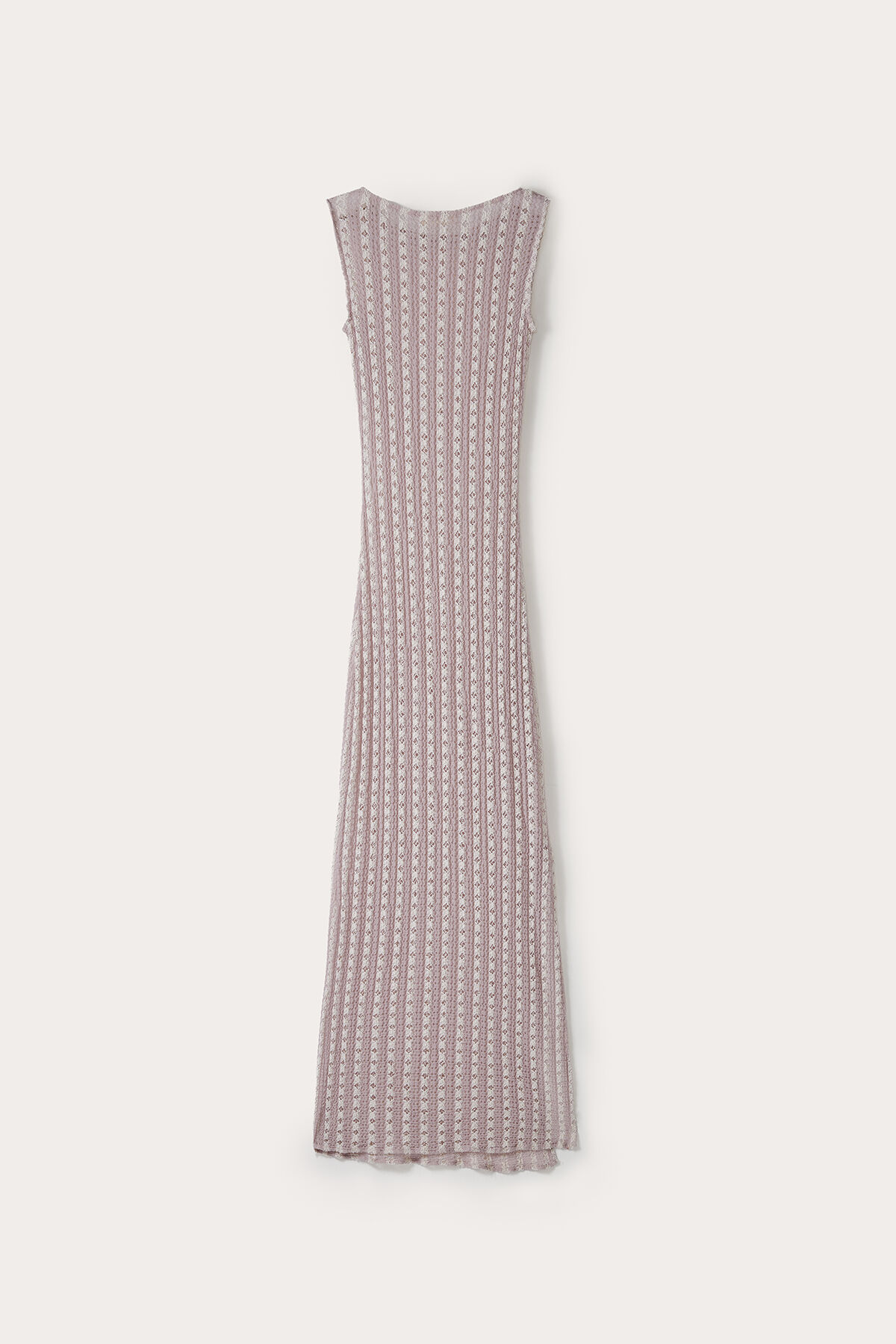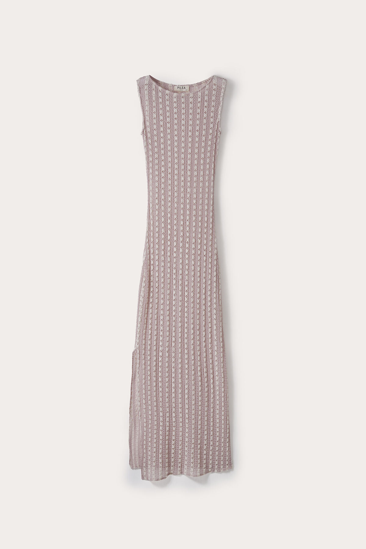 Gelince Haber VerLila ekru çizgili amuk karışımlı dantel kumaştan portatif astarlı kolsuz bisiklet yaka dar kesim yandan yırtmaçlı maksi boy elbise.