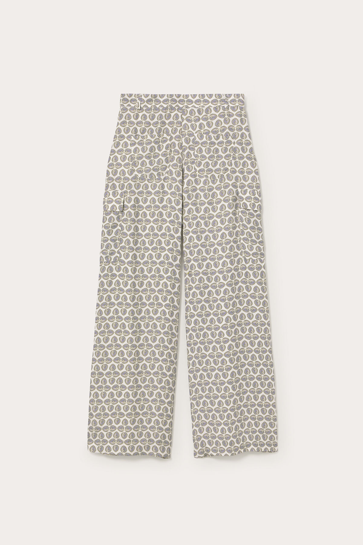 Gelince Haber VerBeli kemerli cep detaylı geniş kesim desenli viskon rayon karışımlı kumaştan pantolon.