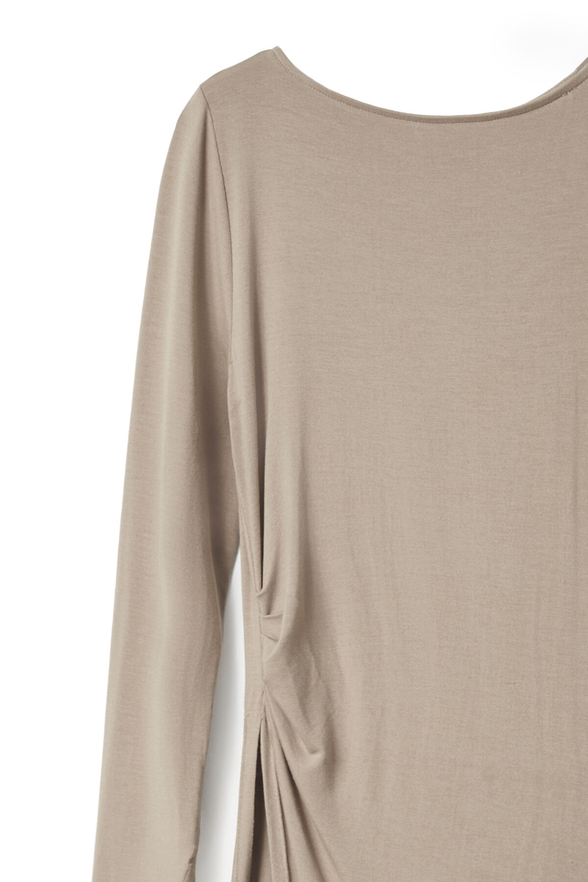 Gelince Haber VerKoyu bej rengi likralı modal kumaştan uzun kollu sıfır yaka fit kesim yanı büzgü detaylı yırtmaçlı maksi boy bluz.